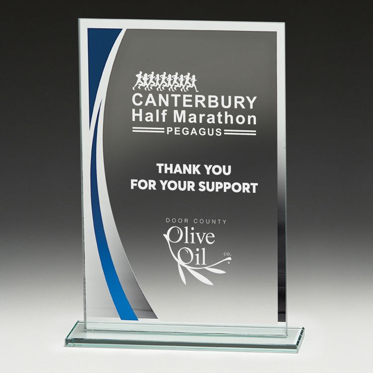 The Coastal Glass award offers a budget friendly option that features eye catching blue and silver highlights to offset your engraving. Available in multiple sizes – with gift box.