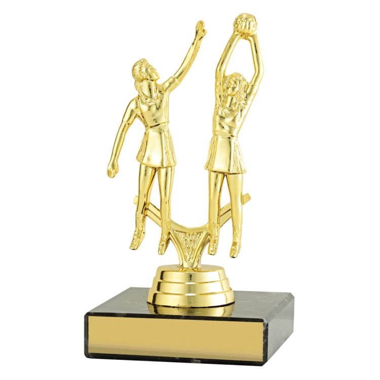 Traditional series of column trophies offer affordable options in different sizes. The gold ‘Dazzle’ design brilliantly shows off the colour and the double player figure is a reliable choice for Netball trophies.