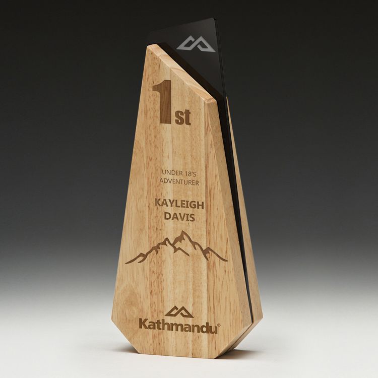 Appealing combination of wood & acrylic elements, the Mawson offers a peak inspired design symbolising achievement & triumph. Use the wood and underlying black acrylic to create an effective rendering of your engraving requirements.