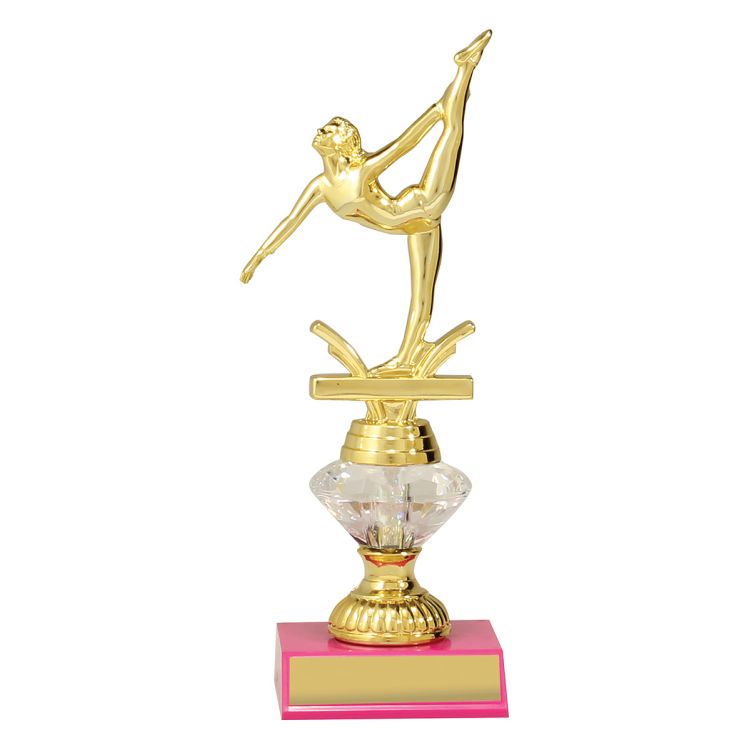 Stylish ‘diamond’ trophies ideal for dance and performing arts. With pink base and diamond riser, trophies are finished with bright gold dance figure.