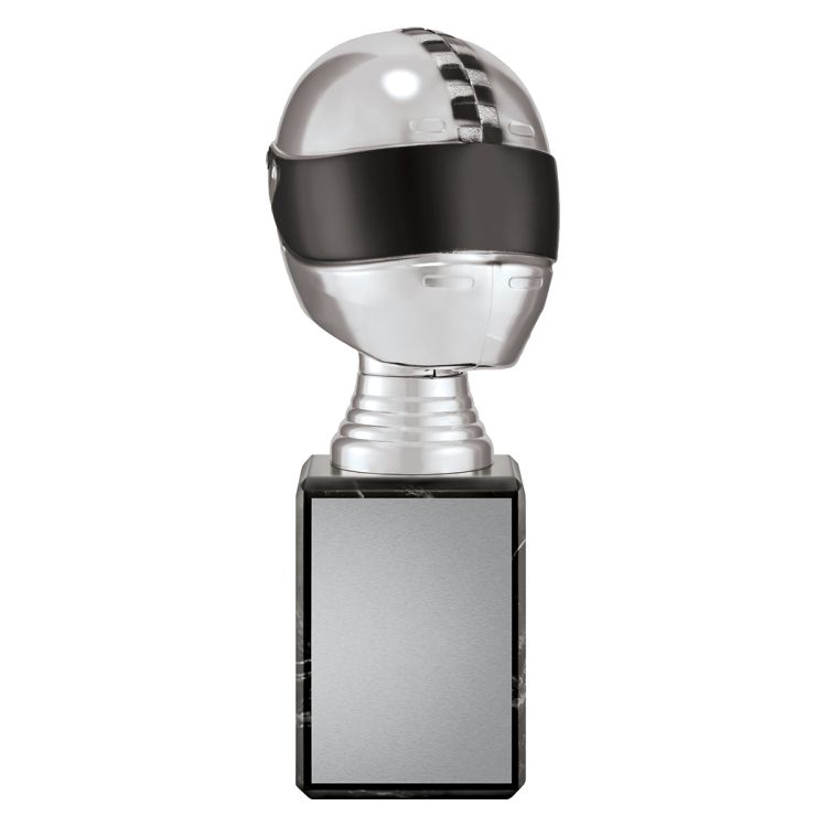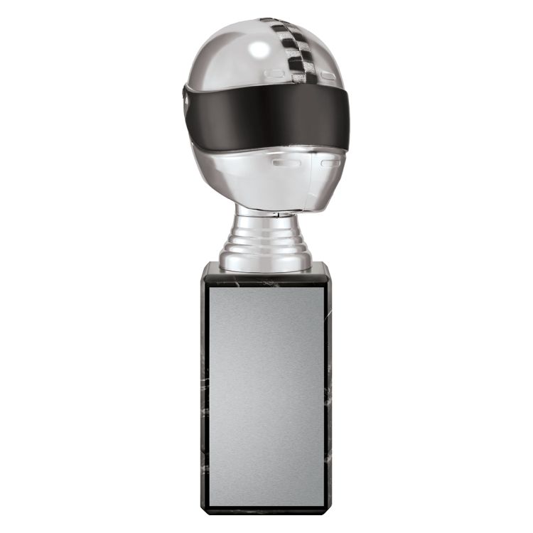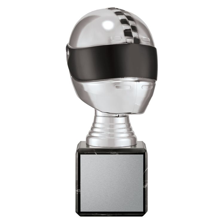 Premium marble tower blocks with outstanding 3D motorsport helmet finished in bright silver – space for personalisation and extra weight for your awards.